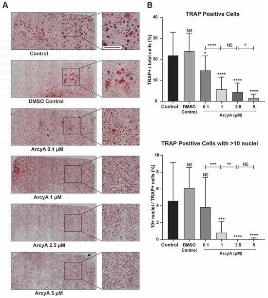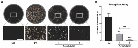 To extend our research from animal cells to human cells, the concentration range was further subdivided to accurately assess the inhibitory effect of ArcyA on human PBMC-derived OCs. The results show that a concentration as low as one tenth (0.1 μM) was sufficient to produce statistically significant effects, suggesting that human mononuclear cells are more sensitive to ArcyA than mouse BMMs. However, further in-depth experiments are needed to gain a deeper understanding of the detailed mechanisms in human cells.