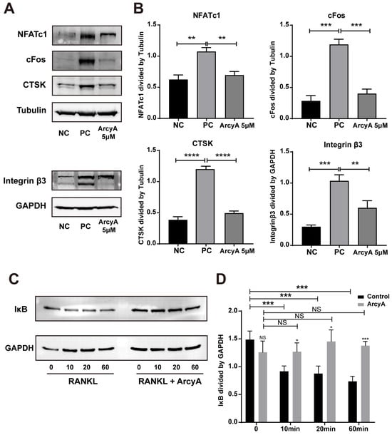 The separated protein samples were transferred onto nitrocellulose membranes using the Trans-Blot® Turbo™ transfer system (Bio-Rad, Berkeley, CA, USA), and blocked with 5% BSA (Carl Roth, Karlsruhe, Germany) for 1 h. The blocked membranes were then incubated with the following primary antibodies: anti-NFATc1 (1:1000); anti-Integrin beta3 (1:1000); anti-IkB (L35A5, 1:1000); anti-Tubulin (D3U1W, 1:5000); and anti-GAPDH (D16H11, 1:5000) produced by CST (Cell Signaling Technology, Danvers, MA, USA), and anti-cFos (T.142.5, 1:1000) and anti-CTSK (Cathepsin K Polyclonal Antibody, 1:1000) produced by Invitrogen (Thermo Fisher, Waltham, MA, USA).