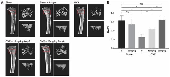 33]. In our study, trabecular 3D-reconstruction imaging and quantitative analysis showed that OVX mice treated with ArcyA exhibited higher BV/TV than the non-treated group without compromising the health of mice, confirming the alleviating effect of ArcyA on OVX-induced osteoporosis. Furthermore, this effect increased with increasing concentration.