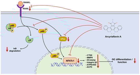 23]. Therefore, the gene expression levels of TNFrsf11a (encoding RANK), c-Fos, and NFATc1 were used to evaluate the activation of OC. In our study, the PCR and western blot results showed downregulation after ArcyA administration (