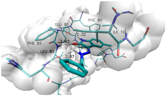 Based on the selected group of substituents, thirty-one derivatives of 5-methylisatin were created, taking into account both the native and modified forms of benzoylhydrazide. The docking procedures conducted for the active site of cyclin-dependent kinase 2 (CDK2) allowed for the formation of complexes for each of the proposed derivatives. The graphical representation of the complex formed by the unsubstituted derivative of 5-methylisatin is shown in Figure 2. The inhibitor molecule is tightly positioned in the hydrophobic pocket of the active site, where the side chains of phenylalanines PHE 80 and PHE 82, as well as isoleucine ILE 10, play a significant role. The inhibitor molecule is also involved in forming hydrogen bonds with glutamic acid GLU 81 and leucine LEU 83. The observed interactions are typical for most of the obtained complexes.