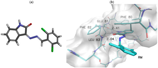 Values of hydrogen bond lengths and distances between aromatic systems involved in the stabilisation of complexes obtained at the docking stage. The designation RM refers to the reference molecule 3-((2,6-Dichlorobenzylidene)hydrazono)indolin-2-one.