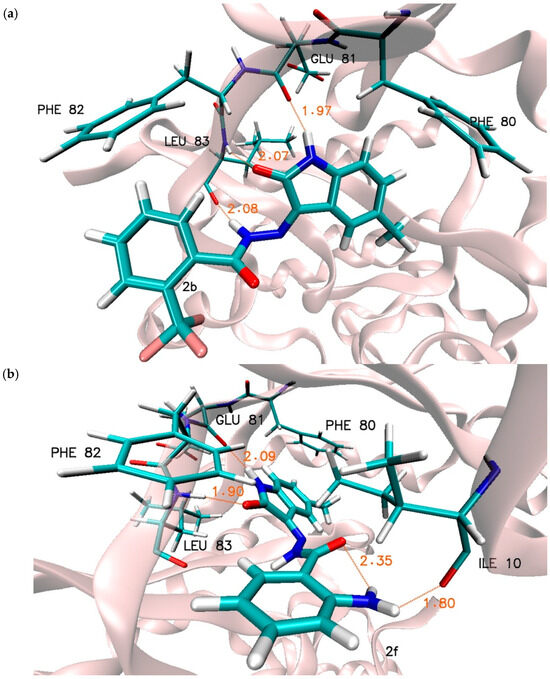 For substitutions at position R2, the greatest variability in affinity values is observed (1.5 kcal/mol), with the highest values recorded for groups that serve as hydrogen bond donors or can participate in halogen interactions. Derivatives with bulky chemical groups at position R2, which may cause steric hindrance (2h, 2g, 2f), exhibited significantly lower binding abilities. Very similar relationships can be observed with substitutions at position R3; however, the discrepancies in binding abilities among the analysed derivatives were significantly smaller (0.74 kcal/mol) compared to the previously analysed group of compounds. The most homogeneous group of derivatives in terms of binding abilities were ligands with substitutions at position R4. Excluding the 4b derivative from the analysis, the range of affinity values for all remaining derivatives would be only 0.34 kcal/mol. This clearly indicates that modifications at this position are the least significant for differentiating the binding abilities of the designed derivatives in the context of interaction with the CDK2 active site. The use of the three fluoromethyl group for each type of substitution caused the greatest increase in the binding abilities of potential CDK2 inhibitors, as evidenced by the affinity values and inhibition constants obtained for derivatives 2b, 3b, and 4b. A significant increase in binding abilities is also observed in the case of molecules where an amino group is used at positions R2 and R3 (2f, 3f). Similar binding abilities towards the active site were also noted for derivatives containing halogen substituents, as well as methyl and nitro groups (2a, 2d, 3e, 3h). For most complexes obtained during the docking stage, similar conformational properties of inhibitors within the active site are observed. Table 2 presents the lengths of the most significant hydrogen bonds and distances between selected hydrophobic centres. Their analysis shows that the modifications introduced in the inhibitors most significantly affect the displacement of hydrophobic centres, and the length of the hydrogen bond formed with the oxygen atom of LEU83. The least variability was noted for the hydrogen bonds formed by the isatin core with GLU81 and LEU83. Considering the geometric criteria for classifying hydrogen bonds, both can be classified as medium-strength interactions, whereas the bond formed by the hydrogen atom from the hydrazine group with Leu 83 O should be classified as a weak bond.