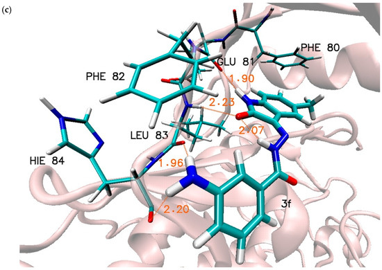 Table 2’s active sites are presented in Figure 3. It can be unequivocally stated that the isatin core of the selected reference compound plays a similar role in stabilising the inhibitor within the active site as in the case of the molecules studied in this work. This is demonstrated by the analogous orientation relative to the amino acids and the interactions identified during the docking stage. The affinity value obtained for the interaction between the reference molecule and the enzyme (−8.62 kcal/mol) is significantly lower than the values observed for the new isatin derivatives considered in this study. In the most extreme cases, the difference exceeds 1.2 kcal/mol. The structure of the complex formed by the reference molecule is similar to the complexes of the compounds under investigation; however, certain differences can be observed. The isatin core is similarly positioned in the hydrophobic pocket of the active site, as indicated by the distance between the aromatic systems of the core and phenylalanine PHE80. However, in the case of hydrogen bonds with GLU81 and LEU83, the distances are significantly greater, which may suggest a slightly weaker stabilising effect. The most pronounced differences between the studied inhibitors and the reference molecule are observed in the aromatic systems attached to the isatin core via a bonding system. The presence of two chlorine atoms in positions 2 and 6 hinders the adoption of conformations that would allow for stacking interactions between the aromatic systems of the inhibitor and PHE82, leading to a reorientation of the aromatic system outside the hydrophobic pocket. The comparison of the energetic and structural characteristics of the complexes formed by the newly designed 5-methylisatin derivatives with the reference system suggests that they may be more effective inhibitors of the CDK2 enzyme.