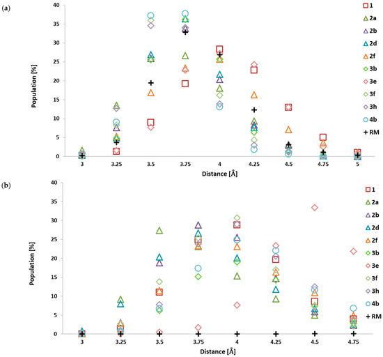 The cumulative analysis of the distances between aromatics systems of 5-methylisatin-based benzoylhydrazines and phenyloalanines PHE80 (a) and PHE 82 (b). The distances presented in chart labels represent middle values of intervals with a width of 0.5 Å.