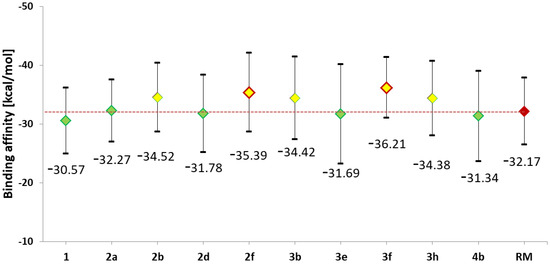 The values of enthalpic contribution to the binding affinity [kcal/mol] estimated for all complexes considered during the molecular dynamics stage. For values marked with yellow indicators, statistical analysis based on one-way analysis of variance (ANOVA) with the pairwise multiple comparison Holm–Sidak method showed a statistically significant difference compared to values obtained for the native system (1). For markers within the red frame, a significant difference was observed relative to the reference molecule (RM).