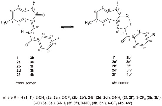 The selected 5-methylisatin-based benzoylhydrazines compounds (1, 2a, 2b, 2d, 2f, 3b, 3e, 3f, 3h and 4b) were synthesised with a good yield and their spectroscopic properties were characterised in three solvents of different polarities. The compounds under investigation, similarly to those previously tested [35], exhibited a pronounced absorption in the wavelength range of 295 nm and 490 nm. Nuclear magnetic resonance spectra demonstrated that 5-methylisatin-based benzoylhydrazines in solution exist in both the cis and trans forms.
