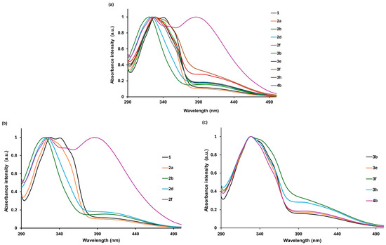 The absorption spectra indicate that the compounds under investigation absorb light in the 290–490 nm range (Table 8). The compounds exhibit a single absorption maximum in the 316–342 nm region (Figure 8a). The 2f derivative (2-NH2) is an exception, exhibiting two absorption maxima (the second at approximately 383–386 nm). The shape and position of the absorption band are only slightly dependent on the polarity of the solvent, while the type and position of the substituent have a greater influence. The greatest effect was observed for substituents located in the ortho position of hydrazine (Figure 8b,c). The synthesised 5-methylisatin-based benzoylhydrazines are characterised by low molar absorption coefficients (Table 8).
