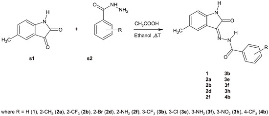 Equimolar amounts of 5-methylisatin (s1) (0.002 mol) and substituted benzoylhydrazine (s2) (0.002 mol) were added to 96% ethanol (50 mL) containing 3 drops of glacial acetic acid. The mixture was heated under reflux for 5 h and then cooled to room temperature. The resulting solid was collected by filtration, washed with cold ethanol and recrystallized from ethanol to give the following compounds (1, 2a, 2b, 2d, 2f, 3b, 3e, 3f, 3h, and 4h).