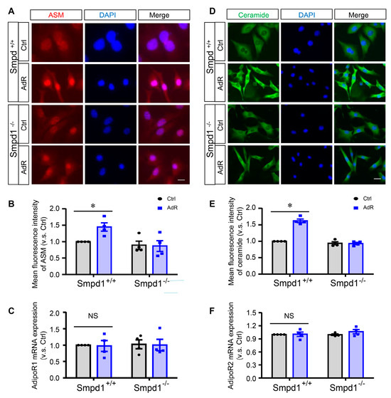 AdipoRon induces ASM-mediated ceramide signaling in SMCs. Smpd1+/+ and Smpd1−/− SMCs were cultured with or without 50 μM adipoRon for 24 h. (A): ASM expression shown in the immunofluorescence images. (B): Fluorescence intensity of ASM quantified. (C): AdipoR1 mRNA expressions. (D): Ceramide expression shown in the immunofluorescence images. (E): Fluorescence intensity of ceramide quantified. (F): AdipoR2 mRNA expressions. * p < 0.05 vs. Smpd1+/+ SMCs without adipoRon. n = 4. Bar = 10 μm. NS: not significant. Ctrl: control. AdR: adipoRon. AdipoR1/2: adipoRon receptor 1/2.