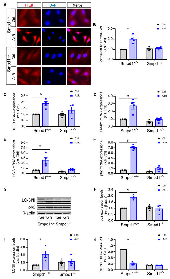ASM deficiency inhibits adipoRon-induced TFEB activation and autophagy in SMCs. Smpd1+/+ and Smpd1−/− SMCs were cultured with or without 50 μM adipoRon for 24 h. (A): TFEB activation shown in the immunofluorescence images (red: TFEB; blue: nuclei). (B): TFEB nuclear translocation quantified. (C): TFEB mRNA expression. (D): LAMP1 mRNA expression. (E): LC-3 mRNA expression. (F): p62 mRNA expression. (G): Immunoblotting images of LC-3I/II and p62. (H): p62 expression level quantified. (I): LC-3II expression quantified. (J): The rate of LC-3I to LC-3II. * p < 0.05 vs. Smpd1+/+ SMCs without AdipoRon. n = 4. Bar = 10 μm. Ctrl: control. AdR: adipoRon.