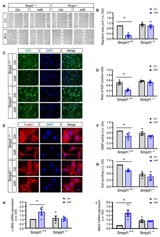 ASM deficiency prevents adipoRon-induced inhibition of proliferation and migration in SMCs. Smpd1+/+ and Smpd1−/− SMCs were cultured with or without 50 μM adipoRon for 24 h. (A): The images of scratch assay in Smpd1+/+ and Smpd1−/− SMCs treated with AdR. (B): The scratch assay quantified in Smpd1+/+ and Smpd1−/− SMCs treated with AdR. (C): Ki67 immunofluorescence images (green) in Smpd1+/+ and Smpd1−/− SMCs treated with AdR. (D): Ki67-positive cells quantified in Smpd1+/+ and Smpd1−/− SMCs treated with AdR. (E): F-actin immunofluorescence images in Smpd1+/+ and Smpd1−/− SMCs treated with AdR. (F): MMP activity quantified in Smpd1+/+ and Smpd1−/− SMCs treated with AdR. (G): Cell number counted in Smpd1+/+ and Smpd1−/− SMCs treated with AdR. (H): α-SMA mRNA expressions in Smpd1+/+ and Smpd1−/− SMCs treated with AdR. (I): SM22 mRNA expressions in Smpd1+/+ and Smpd1−/− SMCs treated with AdR. * p < 0.05 vs. the Ctrl as indicated. n = 4. Bar = 10 μm. MMP: matrix metalloproteinase-9. Ctrl: control. AdR: adipoRon. α-SMA: alpha smooth muscle actin. SM22: transgelin (TAGLN).