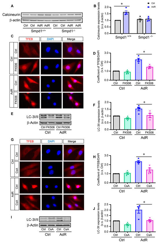 Our previous studies have shown that adipoRon-induced TFEB activation is dependent on intracellular Ca2+ [11]. As shown in Figure 4A,B, immunoblotting results showed that adipoRon significantly increased the expression of the Ca2+-dependent phosphatase calcineurin in Smpd1+/+ SMCs but not in Smpd1−/− SMCs. We then investigated the effects of two calcineurin inhibitors, FK506 and cyclosporin A, on adipoRon-induced TFEB nuclear translocation and LC3 expression in Smpd1+/+ SMCs. Immunofluorescence studies showed that FK506 (Figure 4C,D) or cyclosporin A (Figure 4G,H) significantly attenuated adipoRon-induced TFEB nuclear translocation. Similarly, FK506 (Figure 4E,F) or cyclosporin A (Figure 4I,J) inhibited adipoRon-induced LC-3II expression. Together, these data suggest that calcineurin acts as a downstream effector of the ASM–ceramide pathway to activate TFEB–autophagy signaling in SMCs.