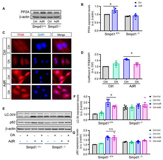 Ceramide has been shown to exert an anti-proliferative effect through PP2A activation [22]. Interestingly, recent studies have reported that PP2A can dephosphorylate TFEB and mediate oxidative-stress-induced TFEB activation in epithelial cells [23]. We sought to investigate whether PP2A plays a role in adipoRon-induced TFEB activation in SMCs. As shown in Figure 5A,B, adipoRon significantly induced PP2A expression in Smpd1+/+ SMCs but not in Smpd1−/− SMCs. Furthermore, inhibition of PP2A by okadaic acid significantly attenuated adipoRon-induced TFEB nuclear translocation (Figure 5C,D) and LC-3II expression in Smpd1+/+ SMCs (Figure 5E,F). Notably, okadaic acid had no effect on the protein expression of p62 in SMCs (Figure 5E,G). Together, these data indicate that activation of PP2A may also contribute to adipoRon-induced TFEB activation and autophagy in SMCs.