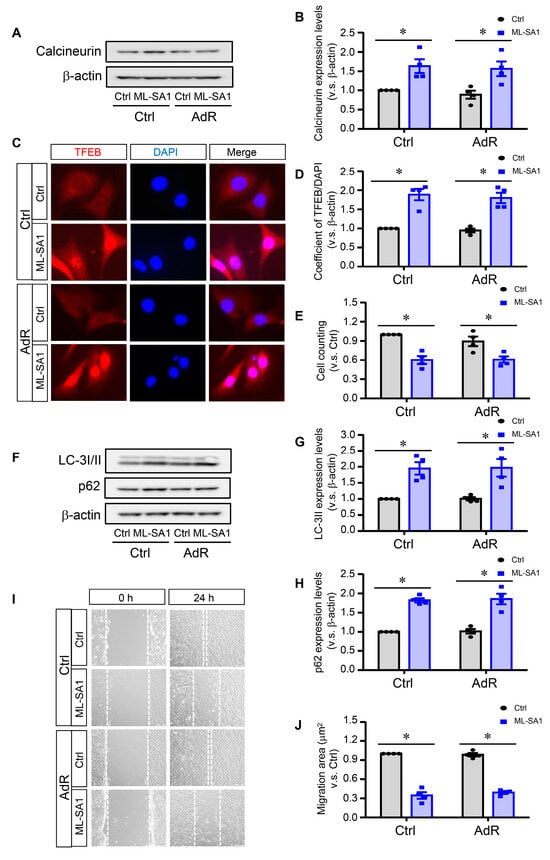 Lysosomal TRPML1-Ca2+ release has been shown to activate the calcineurin–TFEB signaling axis [24]. Here, Smpd1−/− SMCs were treated with a TRPML1 channel activator, ML-SA1, and we examined its impact on adipoRon-induced effects. As shown in Figure 6A,B, ML-SA1 significantly induced calcineurin expressions in Smpd1−/− SMCs to a similar level in the presence or absence of adipoRon. Consistently, ML-SA1 significantly increased TFEB nuclear translocation (Figure 6C,D) and protein expression of LC3-II and p62 (Figure 6F–H) in Smpd1−/− SMCs treated with or without adipoRon. Furthermore, wound scratch assay showed that ML-SA1 significantly decreased cell migration (Figure 6I,J) and inhibited cell proliferation (Figure 6E) in Smpd1−/− SMCs treated with or without adipoRon. These results suggest that ML-SA1 activates calcineurin–TFEB–autophagy signaling and promotes differentiation in Smpd1−/− SMCs regardless of adipoRon treatment.