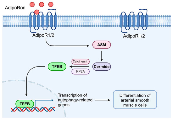 Graphical representation of the mechanism that acid sphingomyelinase regulates adipoRon-induced differentiation of arterial smooth muscle cells via TFEB activation. (Created in BioRender.com).