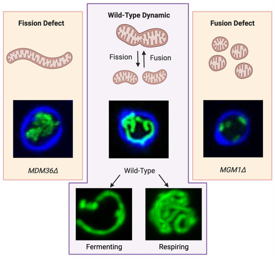 Mitochondria are highly dynamic organelles with morphologies that respond to their environment through a balance of mitochondrial fission, fusion, mitophagy, and biogenesis. In the yeast S. cerevisiae, randomly distributed mitochondrial tubules morph into highly branched, peripherally located mitochondrial networks when the cells transition from fermentation to respiration (Figure 1) [6,23]. When the balance of fission and fusion is disrupted, such as by deleting a gene crucial to either process, mitochondrial morphology is impacted. Cells with defective fission will demonstrate single globular mitochondria, whereas cells with deficient fusion will exhibit multiple small mitochondrial compartments. The balance of both processes is essential for normal mitochondrial form and function [7,9,24].