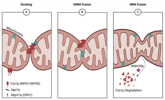 - Anton, F.; Fres, J.M.; Schauss, A.; Pinson, B.; Praefcke, G.J.K.; Langer, T.; Escobar-Henriques, M. Ugo1 and Mdm30 act sequentially during Fzo1-mediated mitochondrial outer membrane fusion. J. Cell Sci. 2011, 124, 1126–1135. [Google Scholar] [CrossRef]