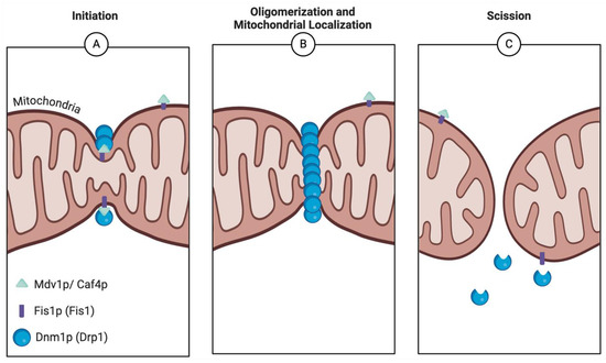 Yeast mitochondrial fission. (A) Dnm1p is recruited to the surface of the mitochondria by Fis1p, which is anchored to the OMM, through adapter proteins such as Mdv1p. (B) On the surface, Dnm1p collects and self-assembles into ring-like structures around the mitochondrial tubule, leading to (C) constriction and the formation of a site for scission.