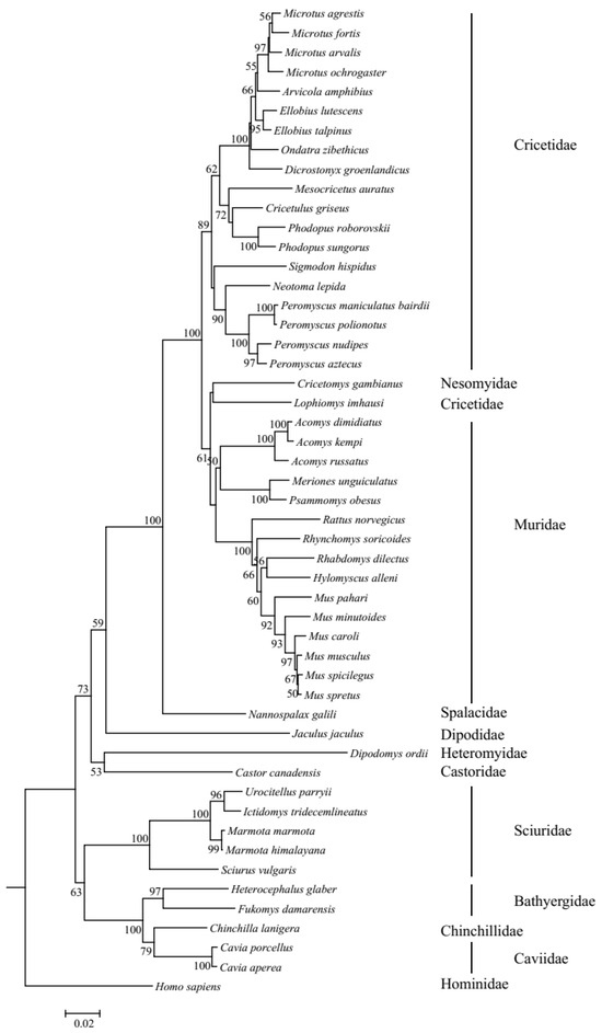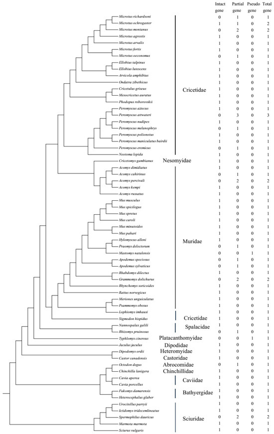 Sixty-four genomes of rodents from 13 families were downloaded, with the genome coverage from 1× to 8356.0× (two species had no genome coverage data) and contig N50 from 1 kb to 122.6 Mb (please see Table S1). After searching against 64 publicly available rodent genomes, 71 UCP1 gene sequences were obtained, including 47 intact genes, 22 partial genes, and 2 pseudogenes, and this distribution is displayed in Figure 1, with the phylogenetic tree referring to Alvarez-Carretero et al. [31]. The UCP1 gene obtained from rodents consists of six exons with a total length of 924 bp, and “Ns” (i.e., unsequenced nucleotide) in exon6 of Microtus oeconomus UCP1 was detected, which is due to either incomplete genome sequencing or poor genomic assembly in this region, whereas in Jaculus jaculus, a 3 bp insertion exists in exon1. In general, a rodent species has only one intact UCP1, if any; some species have more than one partial gene because gene fragments are identified in different scaffolds (Table S2). For example, in Grammomys dolichurus, exon5/6 and exon2/3 are from two scaffolds, respectively; thus, they are assumed to originate from two genes. In Microtus montanus and Acomys percivali, exon1/2/5/6 and exon3/4 are from two scaffolds, while in Apodemus sylvaticus, exon1/2/6 and exon3/4/5 are from two scaffolds; considering that these exons of the three species may be mismatched on different scaffolds, we tried to concatenate them by the order exon1-exon6 and found that they were either intact genes or pseudogenes, and it was hard to judge whether they were correct or not. Thus, we still viewed them as partial genes. As for the pseudogenes, Mastomys natalensis and Typhlomys cinereus each had one pseudogene, with 1 bp deletion in exon2 and 1 bp insertion in exon5, respectively. In addition, three intact UCP1 sequences (accession Nos. AF515781.1, AF271263.1, and MT114186.1) were downloaded from NCBI and then added into the intact gene mentioned above; thus, in total, 50 intact UCP1 genes were obtained and would be applied to the following phylogenetic tree reconstruction and selective analyses. All the intact sequences used in this study are listed in Supplementary Text S1.