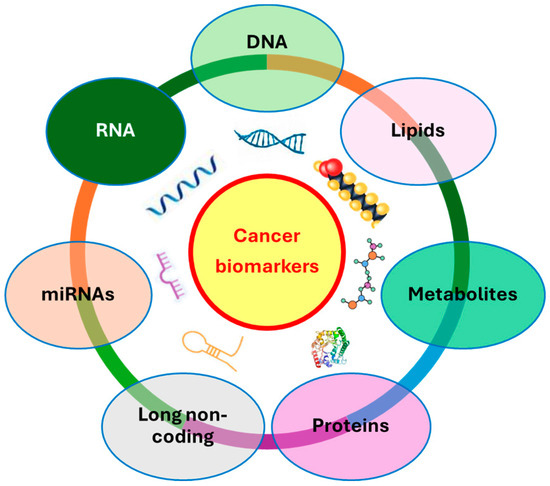 In recent years, advancements in omics technologies have significantly accelerated the identification of a broad spectrum of biomarkers based on DNA, RNA, microRNAs (miRNAs), and long non-coding RNAs, as well as proteins and metabolic and lipid alterations (Figure 1) [1]. These biomarkers, when integrated with clinical and pathological data, provide valuable insights into cancer progression, prognosis, recurrence, and responses to treatment [2]. For instance, the discovery of mutations in the KRAS gene and overexpression of HER2 have provided robust prognostic markers for predicting disease progression and treatment response [3,4]. Similarly, miRNA profiles, such as the upregulation of miR-21 in various cancers, has shown promise as a non-invasive diagnostic and prognostic biomarker [5]. In addition to genetic and RNA-based biomarkers, metabolites have emerged as key players in cancer diagnostics. For example, elevated levels of lactate and pyruvate, often associated with the Warburg effect, have been identified as biomarkers for several cancer types, including glioblastoma and breast cancer, reflecting the tumor’s altered metabolism [6]. Furthermore, changes in lipid profiles, such as the upregulation of phosphatidylcholines and sphingolipids in ovarian cancer, are being explored as potential biomarkers for early detection and monitoring of the treatment response [7].