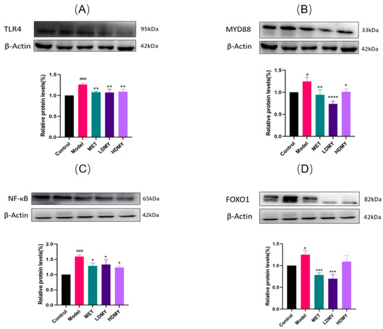 2.4. Effects of VDMY on the TLR4/MyD88/NF-κB and FOXO1 Signaling Pathways in db/db Mice Liver
