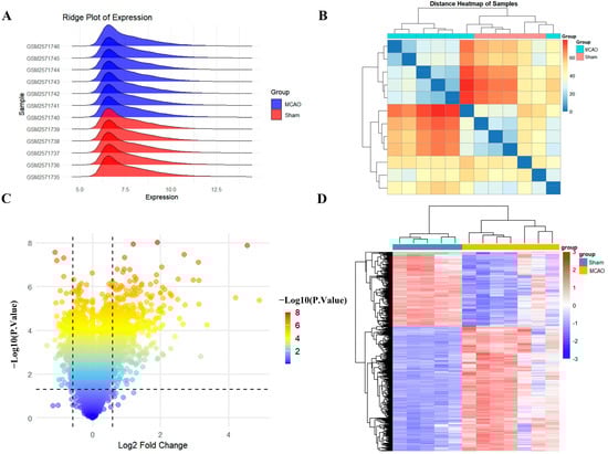 Differential expression analysis between MCAO and sham samples: (A) Distribution of gene expression in the samples. (B) Distance heatmap showing clustering relationships among the samples. (C,D) Volcano plot and heatmap illustrating differentially expressed genes.