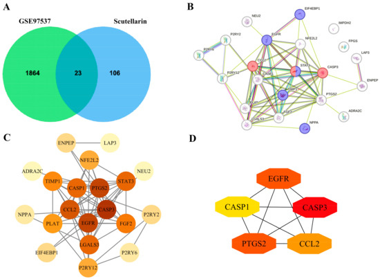 A total of 129 gene targets related to scutellarin in the treatment of IS were identified from database searches. A Venn diagram revealed 23 overlapping targets (Figure 2A). Network analysis of the 23 common targets via STRING platform generated an interaction map comprising 20 nodes with 65 distinct functional connections. Cytoscape 3.7.1 software enabled visualization of the protein–protein interaction network, where color intensity corresponded to correlation strength (Figure 2B,C). Topological analysis based on degree centrality metrics identified five pivotal molecular targets (Figure 2D, Table 1).