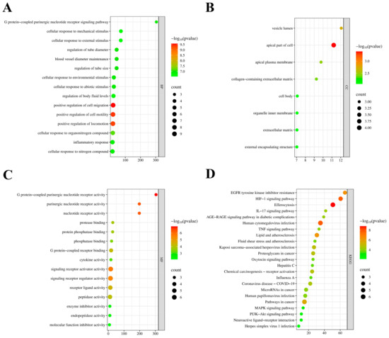 Comprehensive functional characterization of the 23 identified overlapping targets was conducted through Gene Ontology enrichment and KEGG pathway mapping analyses. GO analysis identified 232 enriched terms categorized into biological processes (209), cellular components (8), and molecular functions (15), as illustrated in Figure 3A–C. Within the biological process category, predominant enrichment was observed in pathways regulating cellular movement, including migration, motility, and locomotion mechanisms. Analysis of cellular components revealed significant associations with apical cellular structures, plasma membrane regions, and vesicular compartments. Molecular function analysis revealed significant enrichment in purinergic signaling pathways, specifically involving G protein-coupled nucleotide receptor activities.