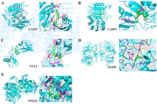 Molecular docking visualization of scutellarin with core targets: (A) Visualization of scutellarin docking with the CASP1 molecule. (B) Visualization of scutellarin docking with the CASP3 molecule. (C) Visualization of scutellarin docking with the CCL2 molecule. (D) Visualization of scutellarin docking with the EGFR molecule. (E) Visualization of scutellarin docking with the PTGS2 molecule.