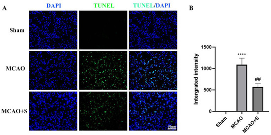 Scutellarin alleviates neuronal apoptosis in the ischemic cortex of MCAO rats at three days: Bar = 50 μm, n = 3. (A) TUNEL immunofluorescence images; (B) Quantitative analysis. **** p < 0.001 vs. Sham group; ## p < 0.01 vs. MCAO group.
