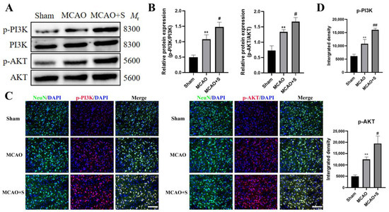 PI3K and AKT phosphorylation analysis in MCAO rat ischemic cortex following scutellarin treatment at day 3: (A,C) Representative Western blots and immunofluorescence micrographs; (B,D) Statistical analyses. Green fluorescence indicates NeuN-positive neurons, blue represents DAPI-labeled nuclei, and red shows Cy3-tagged proteins. Statistical significance: ** p < 0.01 vs. Sham; # p < 0.05, ## p < 0.01 vs. MCAO; Scale bar: 50 μm, n = 5.