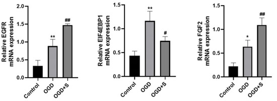 Quantitative RT-PCR analysis revealed that oxygen-glucose deprivation induced significant elevations in the transcriptional levels of EGFR, EIF4EBP1, and FGF2 compared to the control conditions. Following scutellarin administration (OGD + S), a significant augmentation in EGFR and FGF2 transcription was observed, concurrent with a marked reduction in EIF4EBP1 expression relative to the OGD group (p < 0.05, Figure 9). These findings suggest that scutellarin may regulate neuronal apoptosis after IS by upregulating EGFR and FGF2 while downregulating EIF4EBP1 mRNA expression.