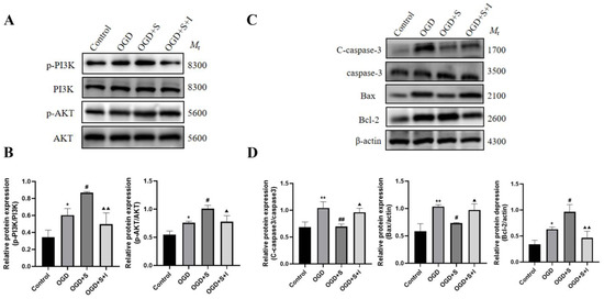 Impact of PI3K inhibition on scutellarin-mediated protein regulation in PC12 cells: (A,C) Western blot bands; (B,D) Quantitative data analysis. Statistical significance: * p < 0.05, ** p < 0.01 vs. Control; # p < 0.05, ## p < 0.01 vs. OGD; ▲ p < 0.05, ▲▲ p < 0.01 vs. OGD+S; n = 5.