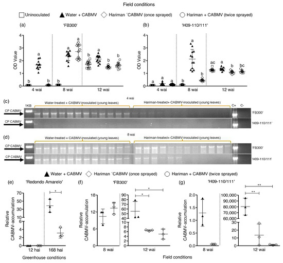 Additionally, significant increases in plant height and leaf count were observed for Hariman + CABMV-treated plants compared with water + CABMV treatments (p < 0.05). Specifically, height increased by 26% for ‘FB300’ and 17% for ‘H09-110/11’ at 5 wai (Figure 2f,g) (p < 0.001), while both genotypes showed over a 30% increase in leaf number at 9 wai (Figure 2h,i) (p < 0.001).