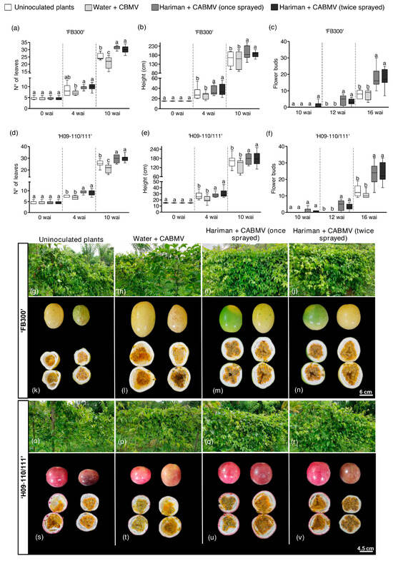 Effect of Hariman on developmental parameters in passion fruit plants under field conditions. Panels (a–c) show the effect of Hariman on ‘FB300’ passion fruit plants at 0–10 weeks after inoculation (wai), including the number of leaves (a), plant height (b), and flower buds (c) at 10–16 wai. Panels (d–f) depict the same parameters for ‘H09-110/111’ plants. Panels (g–v) show the development of whole passion fruit plants for both cultivars at 25 wai. Panels (k–n) and (s–v) show two representative samples of the overall appearance of the fruits obtained under all the experiments from ‘FB300’ and H09-11-/111’ plants, respectively. Bars represent the average of independent replicates (n = 12 plants per treatment), and different letters indicate significant differences (p < 0.05). Box plots show the first and third quartiles with the average represented by the horizontal line inside the box. Whiskers extend to the maximum and minimum values within the interquartile range.