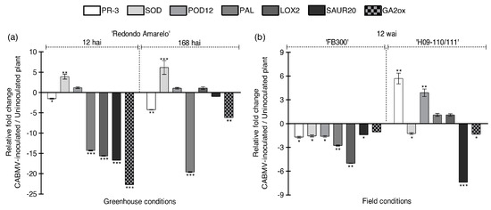 CABMV infection drastically affect expression of defense-related and phytohormone signaling pathway genes of passion fruit plants under greenhouse and field conditions. RT-qPCR results showing relative fold change in gene expression of defense-related genes (PR-3, SOD, POD12, PAL, and LOX2) and phytohormone signaling pathway genes (SAUR20 and GA2ox) in CABMV-inoculated plants versus uninoculated controls. Panel (a) shows data for ‘Redondo Amarelo’ plants at 12 and 168 h after inoculation (hai) under greenhouse conditions, while panel (b) shows data for ‘H09-110/111’ and ‘FB300’ plants at 12 weeks after inoculation (wai) under field conditions. Ct values were normalized to ERS, NDID, and EF1a1. Data are presented as the average relative fold change in mRNA transcripts from three technical replicates of three biologically independent replicates for each treatment and time point. Error bars represent standard deviation. Statistical significance is indicated by * (p < 0.05), ** (p < 0.01), and *** (p < 0.001).