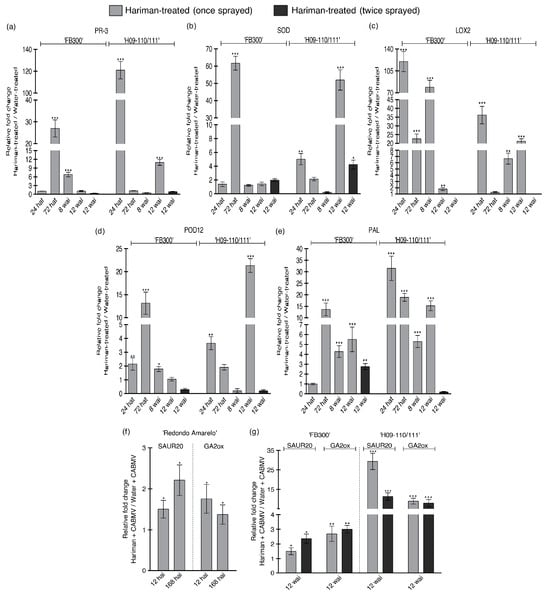 Hariman-induced expression of defense-related and phytohormone signaling pathway genes in CABMV-inoculated passion fruit plants under field and greenhouse conditions. Panels (a–e) show RT-qPCR relative fold change in gene expression of defense-related genes PR-3 (a), SOD (b), LOX2 (c), POD12 (d), and PAL (e) in ‘FB300’ and ‘H09-110/111’ passion fruit plants at 24 and 72 h after treatment (hat) under greenhouse conditions 8 and 12 weeks after inoculation (wai) under field conditions compared with Hariman + CABMV (once and/or twice sprayed) to water + CABMV treatment. Panel (f) presents gene expression of phytohormone signaling pathway genes SAUR20 and GA2ox in ‘Redondo Amarelo’ plants at 12 and 168 h after inoculation (hai) under greenhouse conditions. Panel (g) shows expression of the same phytohormone signaling pathway genes (SAUR20, GA2ox) in ‘FB300’ and ‘H09-110/111’ at 12 wai under field conditions. Gene expression is expressed as the relative fold change in Hariman + CABMV (once and/or twice sprayed) compared with water + CABMV. Ct values were normalized to ERS, NDID, and EF1a1. Data are presented as the average relative fold change in mRNA transcripts from three technical replicates of three biologically independent replicates for each treatment and time point. Error bars represent standard deviation. Statistical significance is indicated by * (p < 0.05), ** (p < 0.01), and *** (p < 0.001).