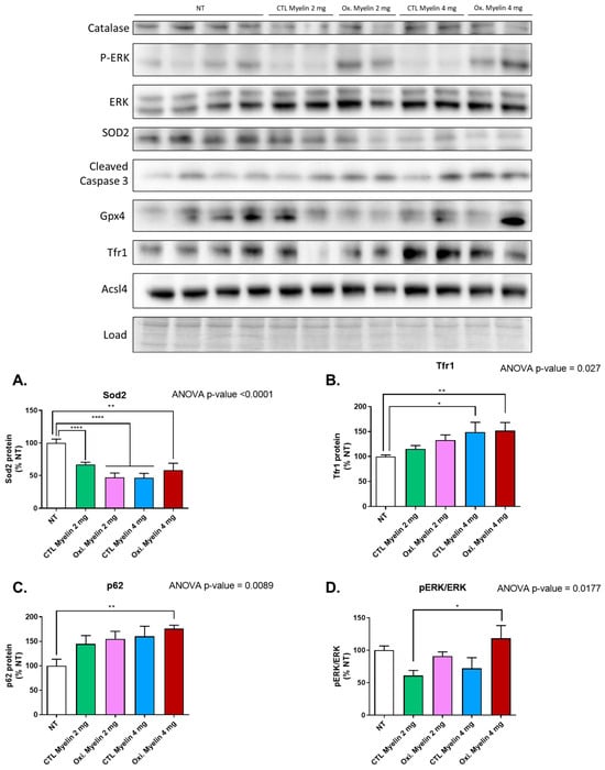 2.3. Myelin Exposure Triggers Changes in Antioxidant Enzymes, Autophagy Markers, and Proteins Regulating Iron Metabolism in BV-2 Cell Line