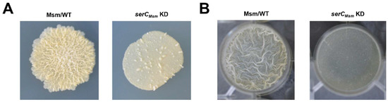 Effects of serCMsm repression on the physiological phenotypes of M. smegmatis. (A) Spot colony morphology of the Msm/WT strain and the serCMsm KD strain in the presence of anhydrotetracycline. (B) The biofilm formation at the air–liquid surface of the Msm/WT strain and the serCMsm KD strain in the presence of anhydrotetracycline.