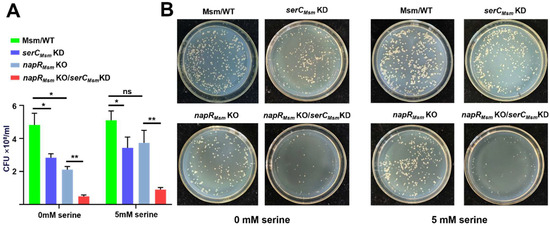 NapRMsm activates serCMsm to positively regulate the growth of M. smegmatis on solid media. (A) Quantification of colony counts of M. smegmatis on 7H10 solid medium. (B) Representative images of M. smegmatis colonies on 7H10 solid medium. Equal amounts of the Msm/WT, serCMsm KD, napRMsm KO and napRMsm KO/serCMsm KD strains were plated on 7H10 solid medium supplemented with 0 mM or 5 mM serine, and colony counts were recorded after 4 days. ns p ≥ 0.05, * p < 0.05, ** p < 0.01.
