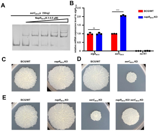 Based on sequence alignment, we found that NapRMsm in M. smegmatis shares up to 76.6% homology with NapRBCG in the BCG vaccine strain (Figure S4). Meanwhile, SerCMsm in M. smegmatis shares up to 81.5% homology with SerCBCG in the BCG vaccine strain (Figure S5). As the BCG vaccine is an attenuated strain of M. bovis, we used the BCG vaccine as a representative pathogenic strain to investigate how NapRBCG regulates serCBCG and to explore its effects on the physiological phenotypes of the BCG vaccine.