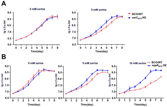 NapRBCG represses the expression of serCBCG to alleviate growth inhibition caused by high serine concentrations in BCG vaccine. (A) Growth curves of BCG/WT and serCBCG KD strains under the condition of 0 mM or 5 mM serine. (B) Growth curves of BCG/WT and napRBCG OE strains under the condition of 0 mM, 5 mM, or 10 mM serine.