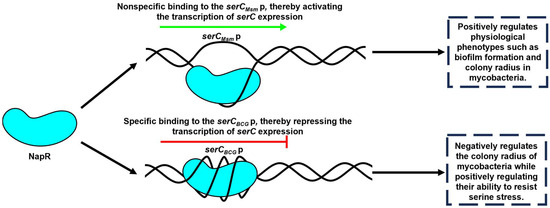 In this study, we investigated the regulatory relationship between NapR and serC, and explored their impact on mycobacteria growth, colony morphology, and biofilm formation in both nonpathogenic strains, represented by M. smegmatis, and pathogenic strains, represented by the BCG vaccine. Our findings demonstrate that NapR functions as a transcriptional regulator of serC by binding directly to the serC promoter; however, the regulatory mechanism and its physiological consequences exhibit significant strain-specific differences. In M. smegmatis, NapRMsm positively regulates colony radius and biofilm formation by activating serCMsm. In contrast, in the BCG vaccine, NapRBCG exerts a negative regulatory effect on BCG vaccine colony size, but facilitates the BCG vaccine’s tolerance to serine stress by repressing serCBCG (Figure 7).