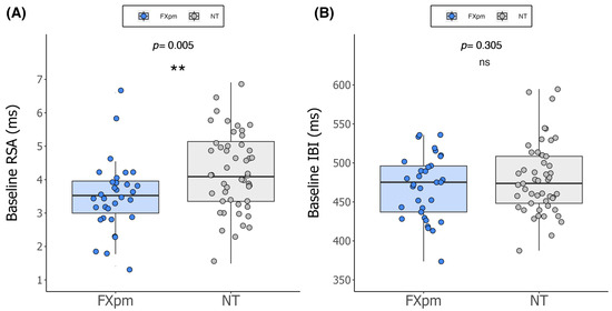Figure 1. Baseline cardiac activity as a function of group. Note. Distribution of (A) respiratory sinus arrhythmia (RSA) and (B) interbeat interval (IBI) in fragile X premutation (FXpm) and neurotypical (NT) groups. ** p  0.01, ns = non-significant (p > 0.05).