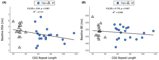 Follow-up regression models with only the FXpm group were conducted. Results were similar. For RSA and IBI, neither CGG repeat (RSA: B = −0.055, p = 0.747; IBI: B = −1.861, p = 0.762) nor CGG repeat2 (RSA: B = 0.000, p = 0.791; IBI: B = 0.010, p = 0.790) were significant predictors. To confirm the lack of significance was not due to insufficient power within the FXpm sample, Pearson correlations were evaluated. The analysis revealed a non-significant relationship between RSA and CGG repeat (r(19) = −0.141, p = 0.564) and between RSA and CGG repeat2 (r(19) = −0.134, p = 0.586). The analysis also confirmed a non-significant relationship between IBI and CGG repeat (r(19) = −0.092, p = 0.707) and between IBI and CGG repeat2 (r(19) = −0.085, p = 0.730).