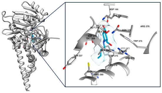 Following the protocol outlined in the Materials and Methods section, induced fit docking of the inhibitor with the GCS structure using the Maestro Schrödinger software suite (v. 2020-3) was performed. This approach optimized the receptor–inhibitor interactions to account for potential conformational flexibility within the GCS binding site. As a result, 18 distinct docking poses were generated. The top-ranked pose, exhibiting a docking score of −7.349, was selected for further analysis based on its predicted stability and favorable binding interactions with the target (Figure 1). This choice was guided by the docking score and a detailed visual inspection of the binding interface.