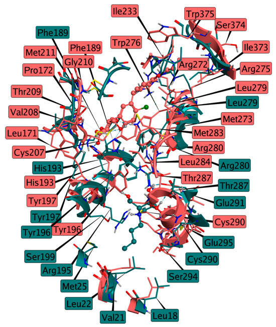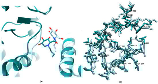 Comparison of the system between the best pose obtained from induced fit docking protocol and the binding after cluster analysis of the last 500 ns of the MD simulation. (a) The most representative structure from the MD simulation clustering is shown in teal, with the best pose from the induced fit docking procedure depicted in light cyan. (b) Using the same color code, the amino acids within 5 Å of the inhibitor are displayed, revealing shifts in key residues such as Arg 275, Trp 375, His 193, Trp 276, Asp 144, Pro 172, and Tyr 197.