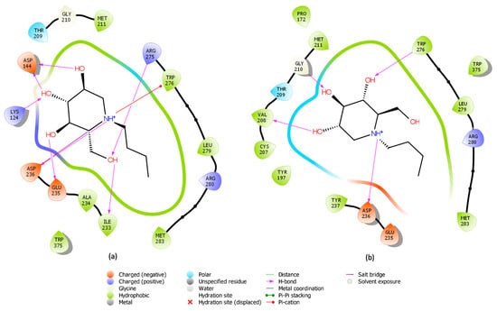 Comparison of Miglustat interactions analyzed using the Maestro Schrödinger software ligand interaction tools. (a) Interactions after induced fit docking. (b) Interactions based on the clustering analysis of the final 500 ns of the MD simulation.