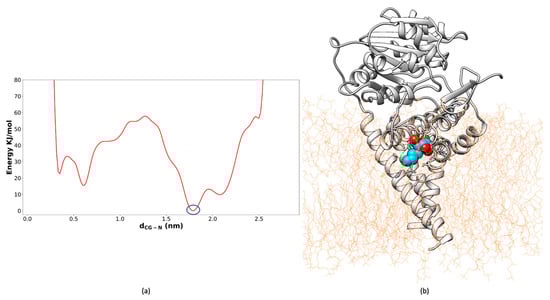 FM analysis. (a) Energy profile of the simulation reporting the absolute minimum of energy (blue circle) in function of the CV3 (dCG-N), specifically at distance of 1.77 nm between the two chosen atoms. (b) Miglustat (displayed in sphere representation, with carbon atoms in cyan and oxygen atoms in red) in its most energetically favorable state, showing a specific orientation to replace the ceramide, as studied in previous work [].